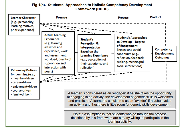 However, the 3P model described above does not apply to holistic competency development because a student adopting a deep approach to learning by seeking to understand the meaning of a holistic competency such as leadership skills, does not mean that he/she will be able to develop leadership skills. In other words, the words ‘deep’ and ‘surface’ with respect to learning academic knowledge are unsuitable in the context of holistic competency development. Instead, a new term “Approach to Develop” was coined by Chan in her Holistic Competency Development Framework (HCDF) which conceptualizes student engagement in experiential learning leading to the development of holistic competencies.
