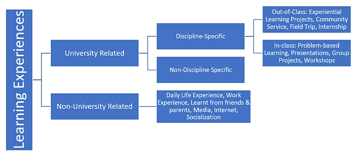 Adapting Bigg’s 3P Student Approach to Learn model (1987), Chan and Yeung (2019) developed the Holistic Competency Development Framework (HCDF) to help us understand how holistic competencies can be developed (see the table). The HCDF consists of five key components that are fundamental to holistic competency development: 1) student characteristics; 2) rationale for learning; 3) students’ actual learning experience and perceptions and interpretations based on that experience; 4) students’ approaches to developing holistic competency; and 5) students’ development of holistic competency as outcomes. Chan and her team found that among 1232 undergraduate students in Hong Kong, there was a general agreement that holistic competencies are better developed through out-of-class, extra-curricular activities and daily experience. Yet, it can be observed from the figure below that majority of these activities are not compulsory, and are often initiated by the students themselves. Thus, as illustrated by the HCDF framework, students’ motivation and rationale is an important prerequisite for student engagement in the different learning experiences which promote holistic competency development. Their motivation and rationale can be meaning-driven, career-driven, course driven, family driven or even pleasure-driven.