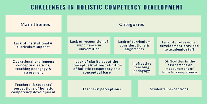 By conducting a critical review of the literature, Chan and her team (Chan et al., 2017) identified and examined different challenges in the development of holistic competencies in higher education. As presented in the following figure, the challenges were categorized into eight categories under three main themes: